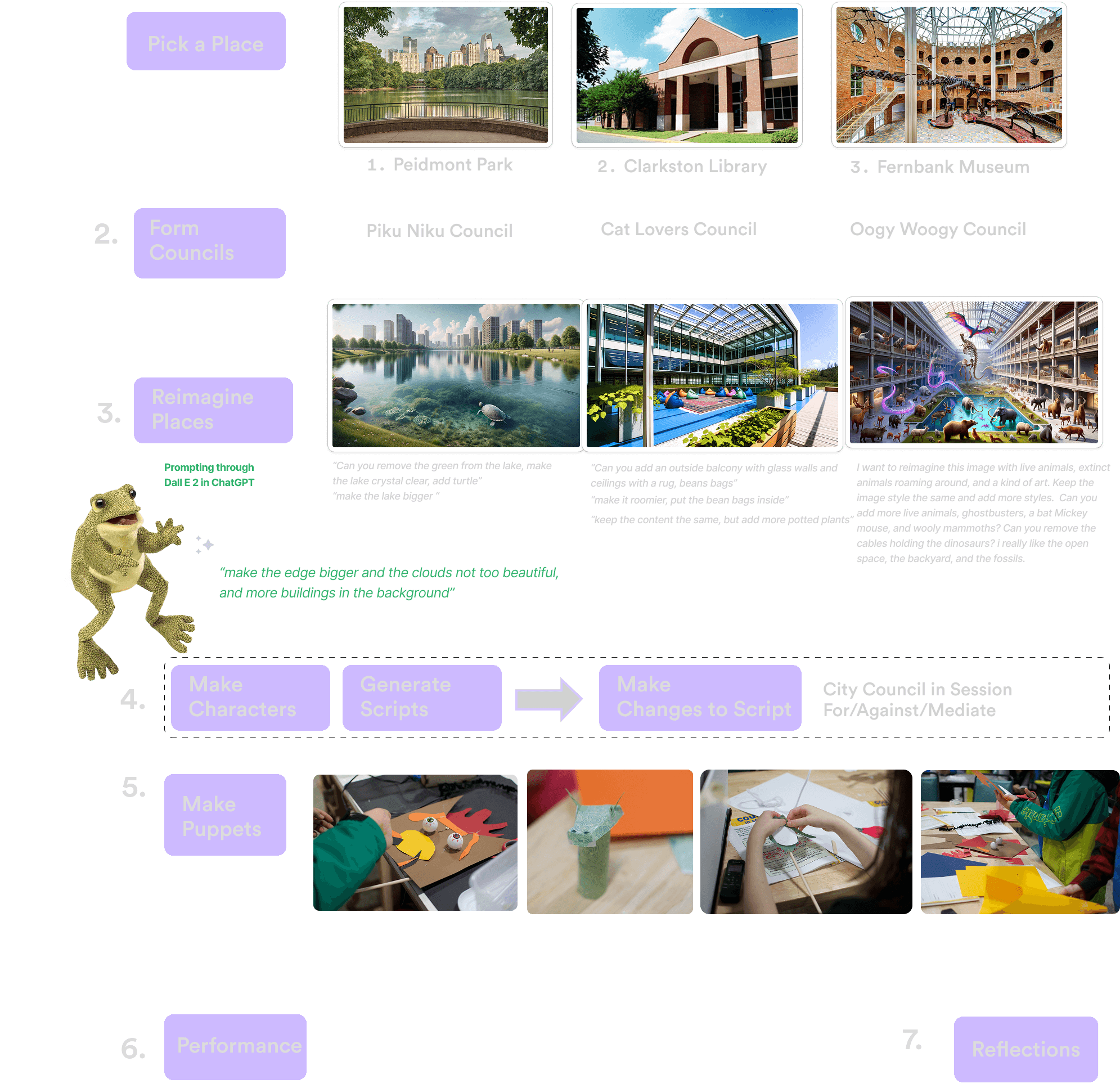 Phase 1: AI Visualization (45 min) Teams selected local spaces (Library, Park, Museum) and used ChatGPT to generate images of their "future vision" for these locations.