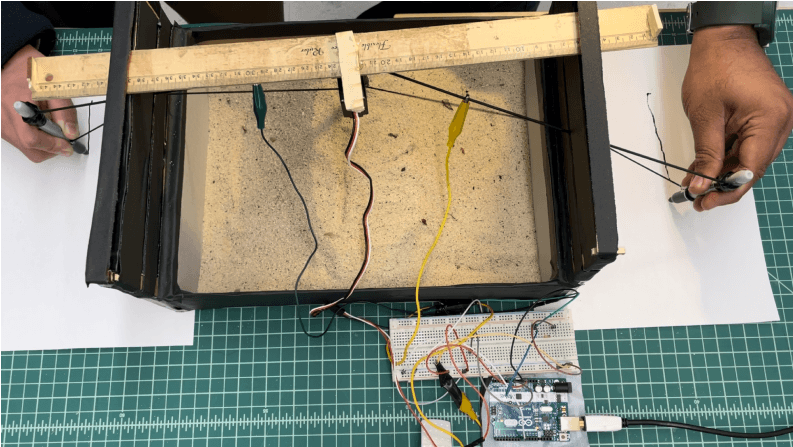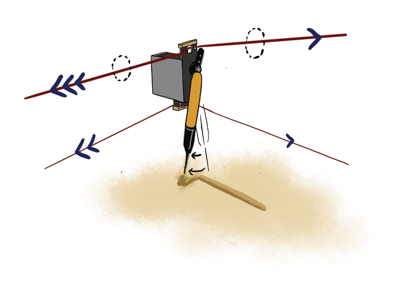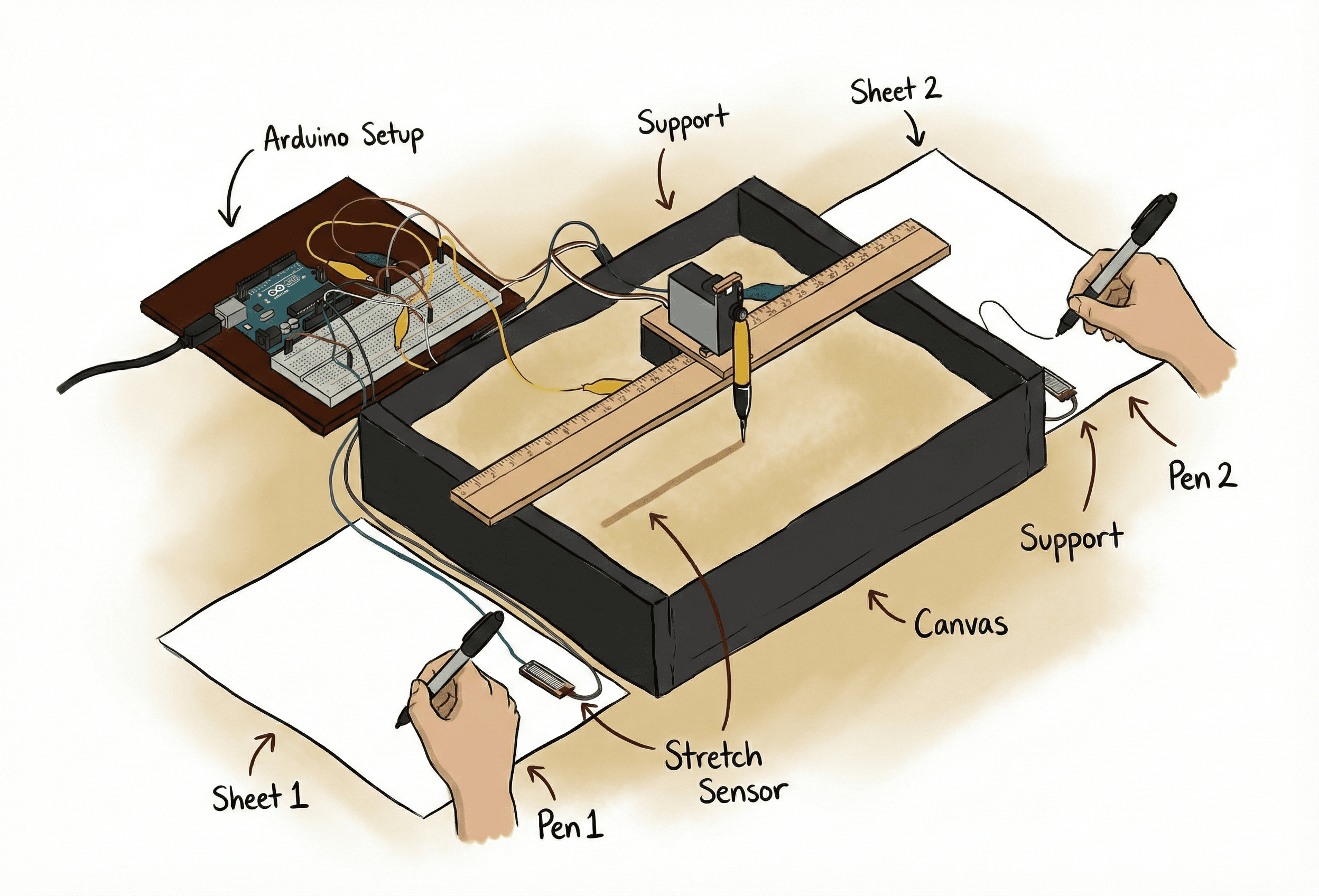 Scenario A (Harmony): Both users move their pens at similar speeds and distances. The tension on the cord remains stable or changes uniformly. The Arduino interprets this as "Equal Contribution." The servo motor glides smoothly, leaving a clean, uniform track in the sand.